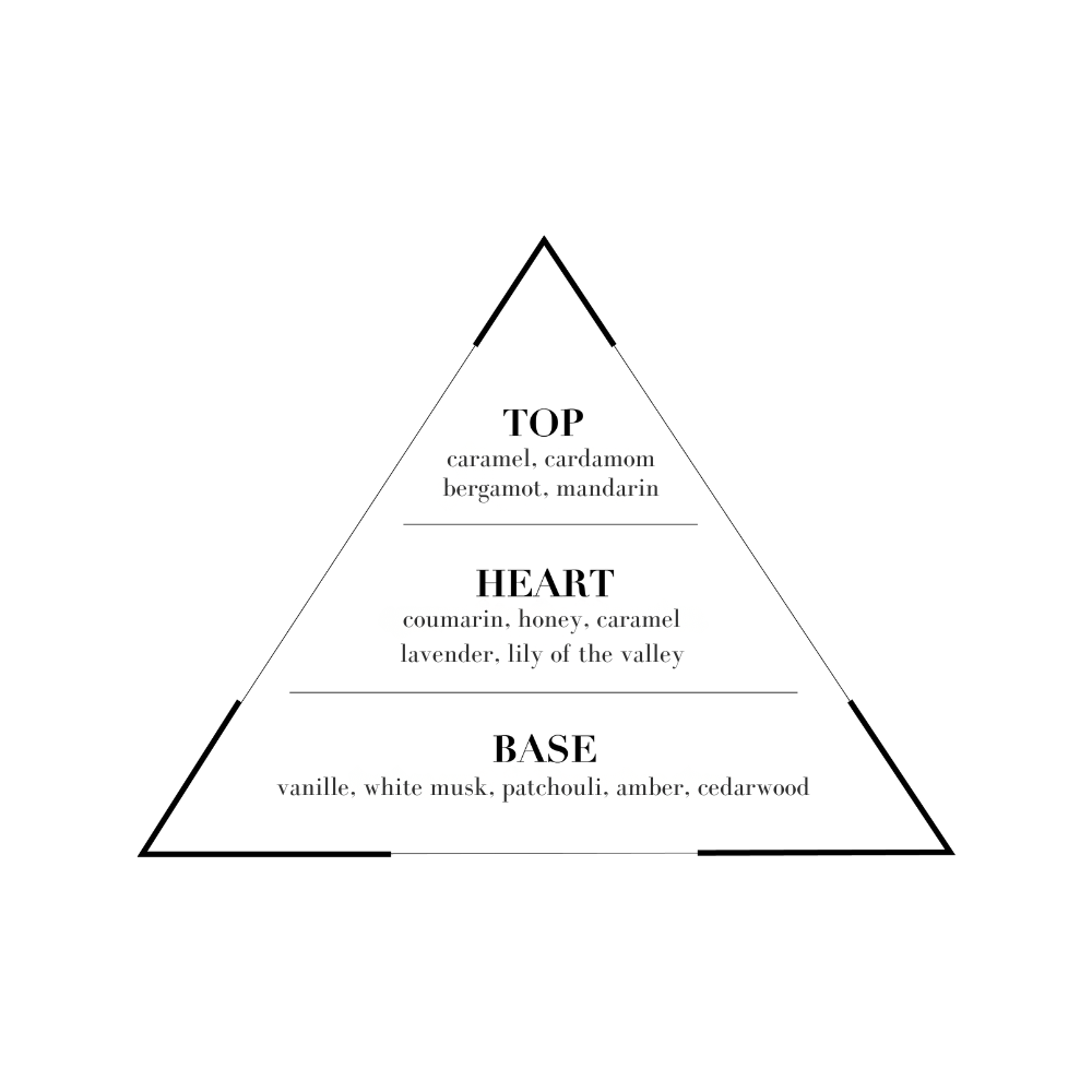 This perfume opens brightly with bergamot and mandarin, warmed by a hint of cardamom and caramelized sugar. The heart notes are softer: honey, coumarin, and a trace of lavender and lily of the valley create a rounded, comfortable feeling. The base is warm and clean with vanilla, white musk, patchouli and more.